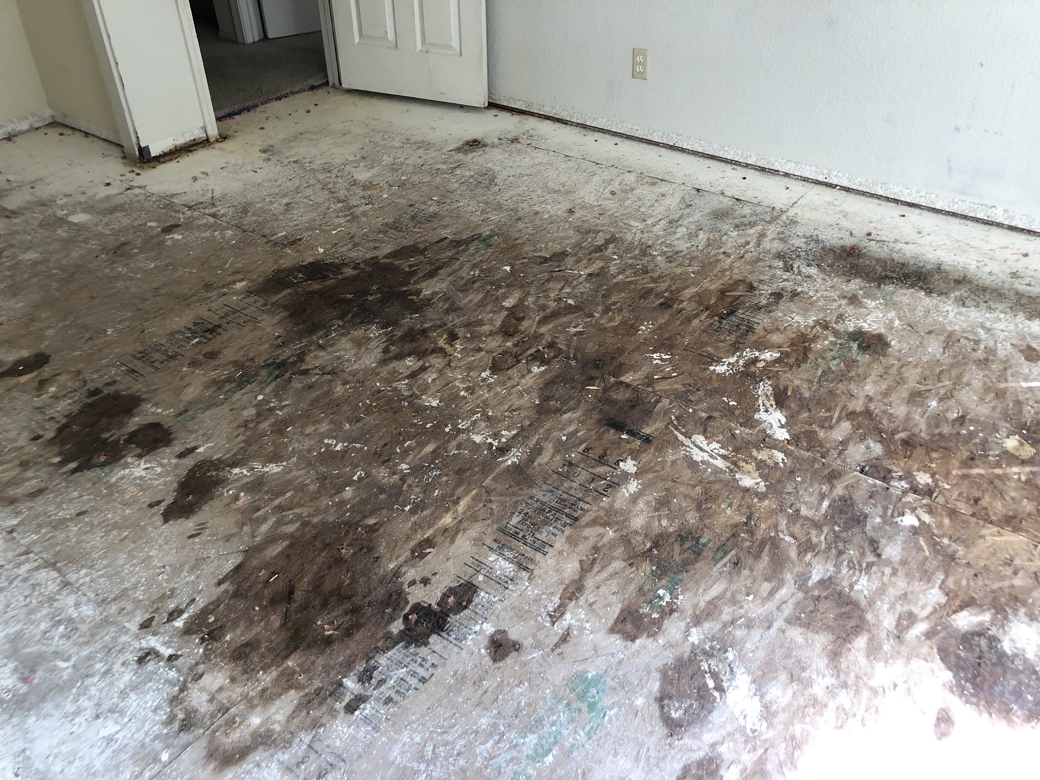 This is an image of what the subfloor looks like after carpet and pad were removed from a bedroom where a tenant kept a dog who who urinated excessively in the house (in violation of the rental lease, of course). In preparing this home for sale, BEFORE new flooring could be installed in this room, a contractor treated the subfloor with an enzyme in an attempt to kill the odor. They then had to apply an oil based sealer. And then new carpet, pad, and baseboards were installed, and the room painted.